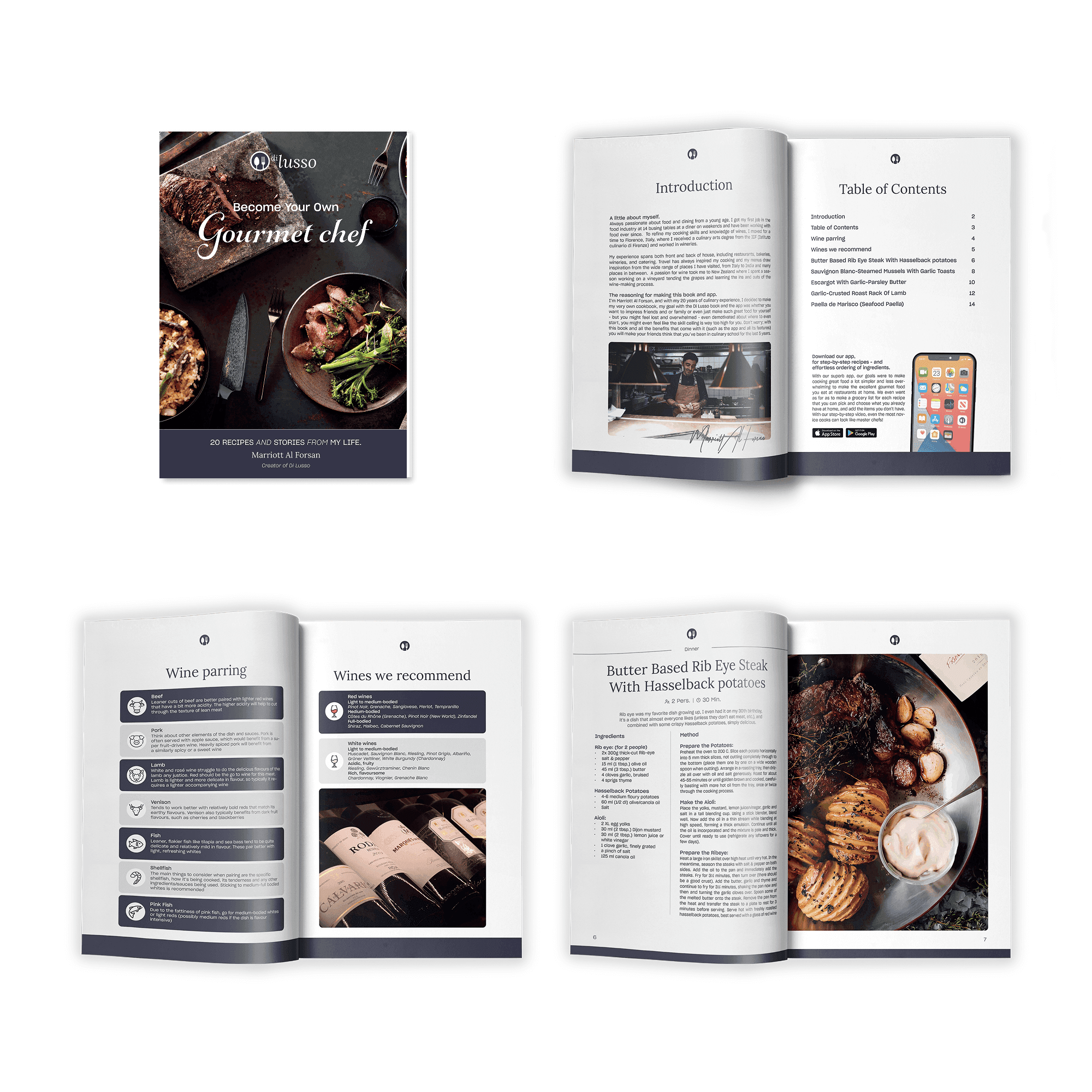 My vision was to create a cookbook that catered to the highest end of the market, without reaching the level of the Alchemist restaurant, which boasts a darker, more opulent aesthetic and features fewer recipes and more high-end ingredients. For my cookbook, I aimed to focus on simple yet refined recipes and upscale food products. I envisioned a color scheme that incorporated dark blues, white, black, and metallic shades such as gold and silver.